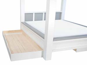 Die Laden werden aus 3 Schicht-Massivholzplatten aus Fichtenholz hergestellt und sind innen natur lackiert. Die Außenseite ist aus dem gleichen Material und genauso lackiert wie das restliche Bett.