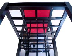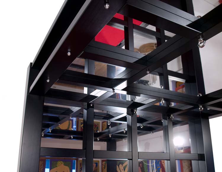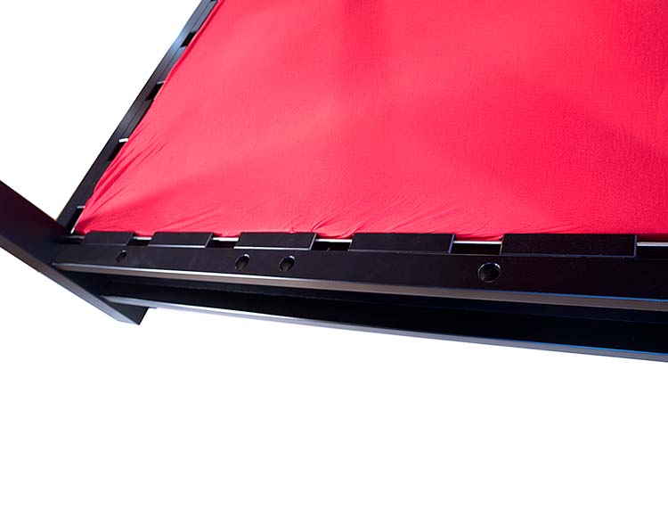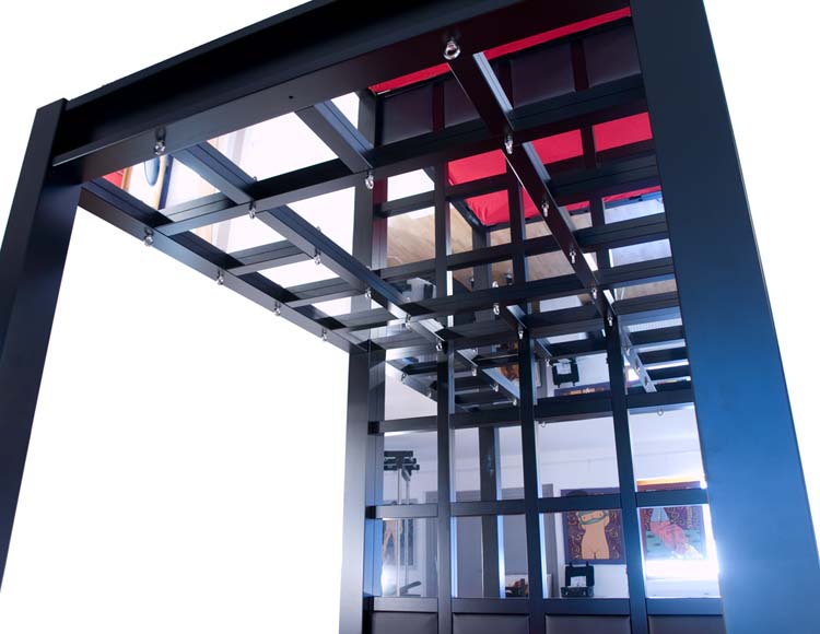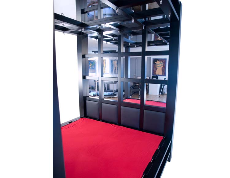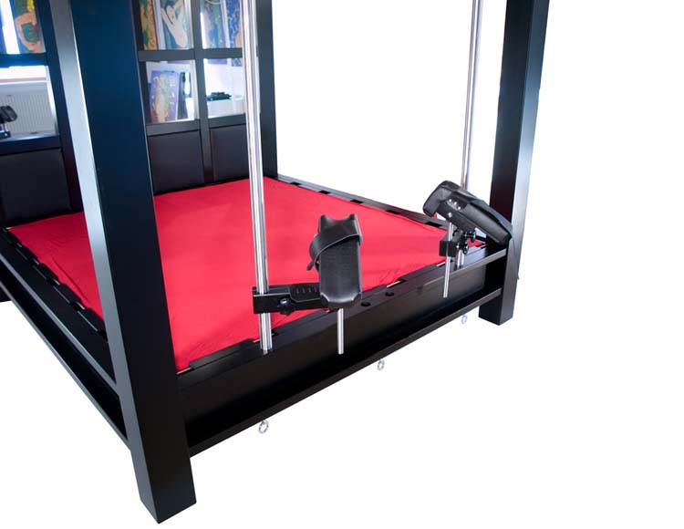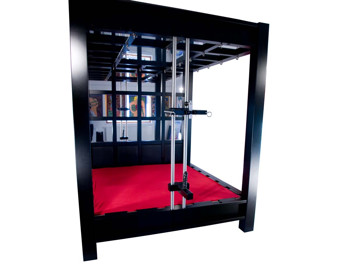 Im Holz versenkt ist eine umlaufende Edelstahl-Reling, die sich mit üppigen Lederpolstern abdecken lässt. Sie eignet sich für alle denkbaren Fesselspiele, besonders gut jedoch für die Bondage mit Seilen oder Ketten mit Karabinern. 23 Ringösen an den massiven Holzbalken bieten noch mehr Optionen zum Fixieren. Bei Bedarf verschwinden alle verräterischen Details mit wenigen Handgriffen unter verschiedenen Abdeckungen.